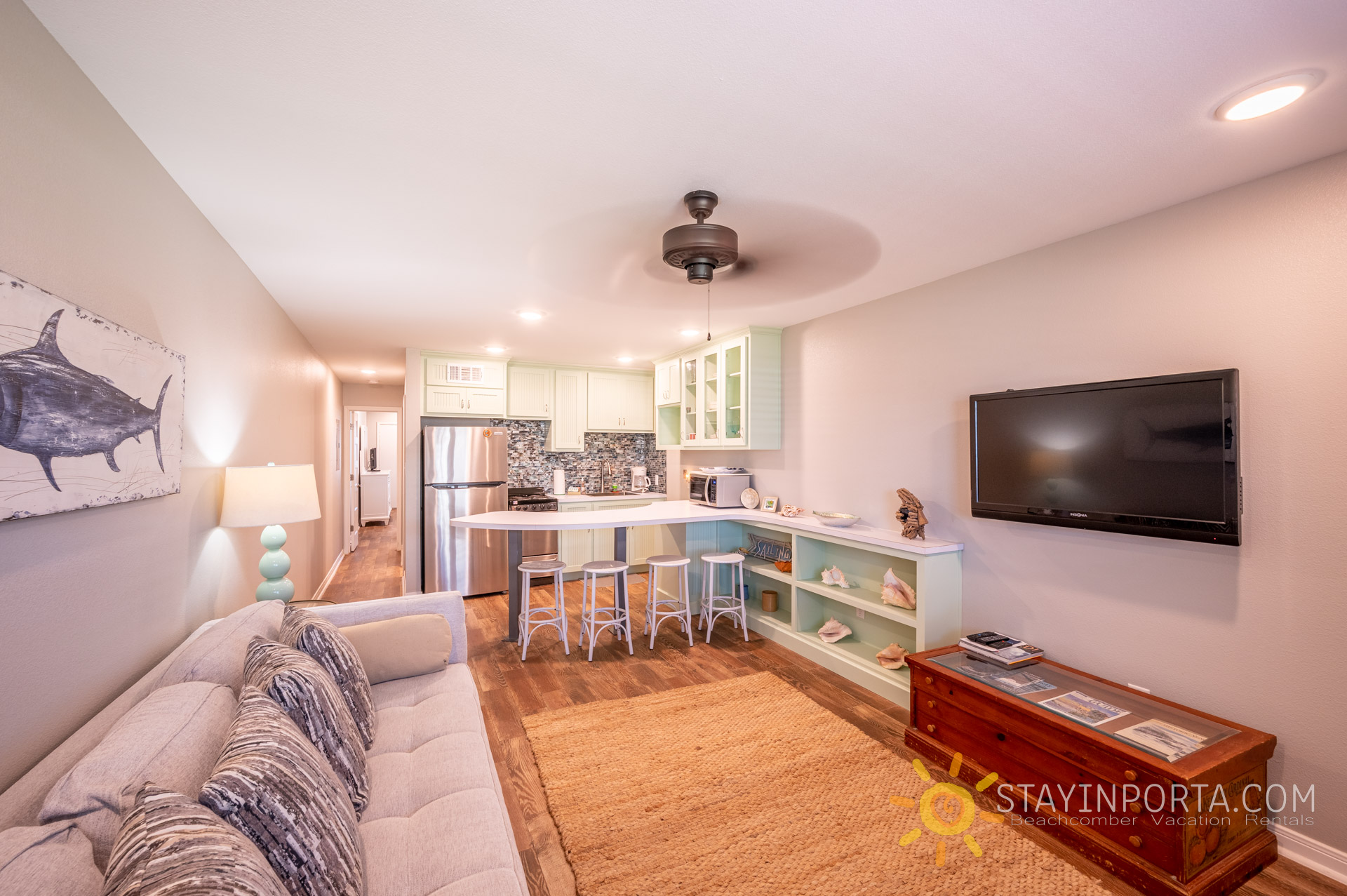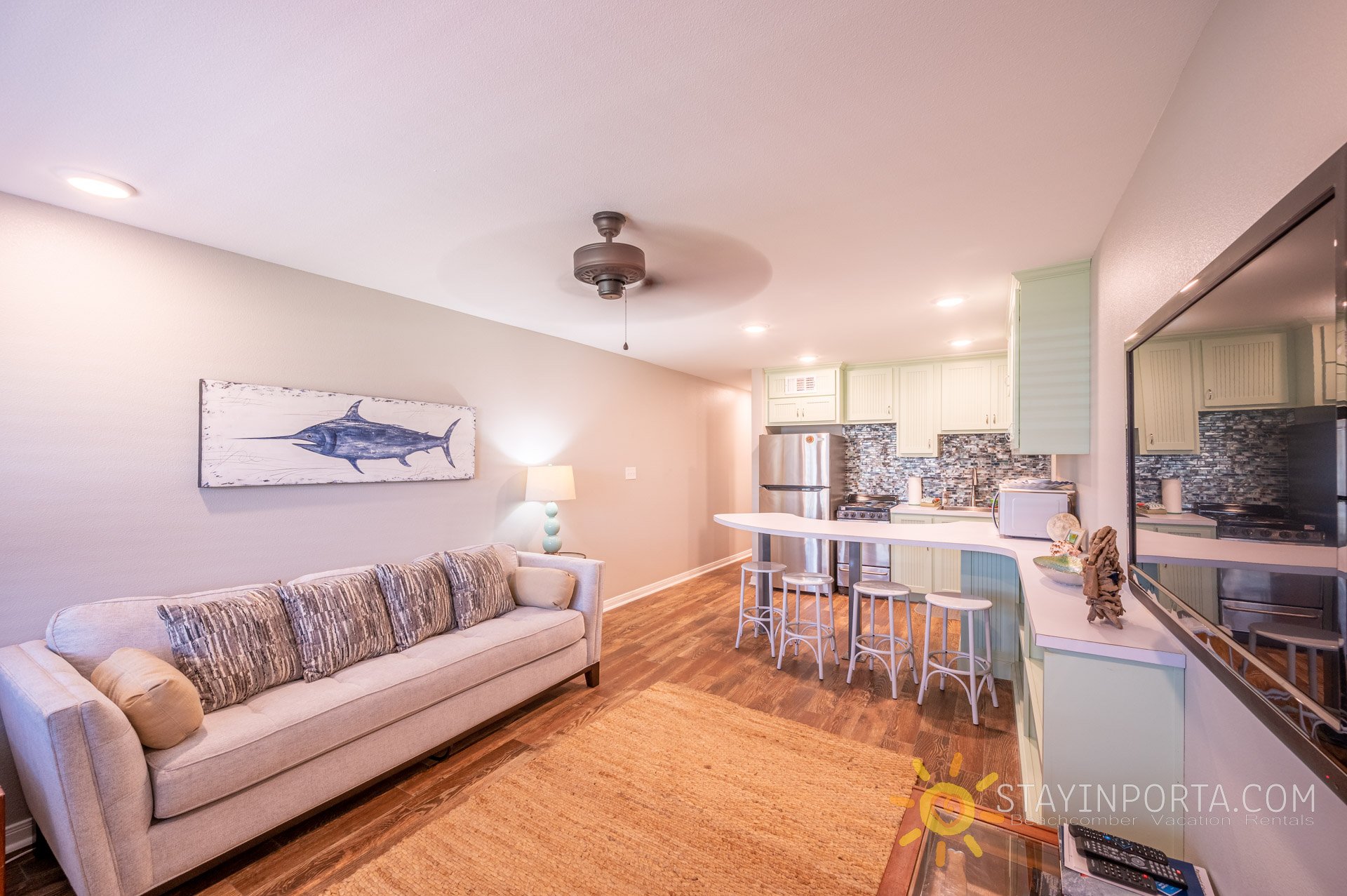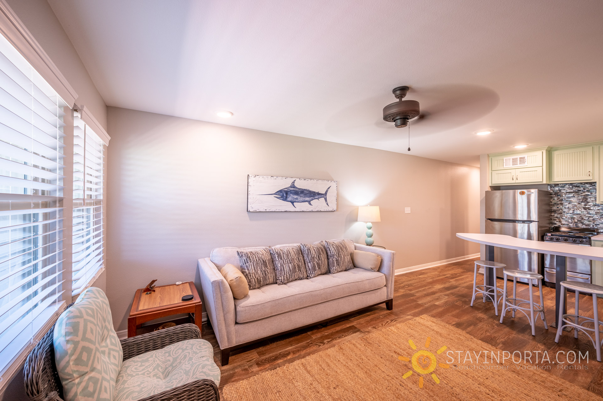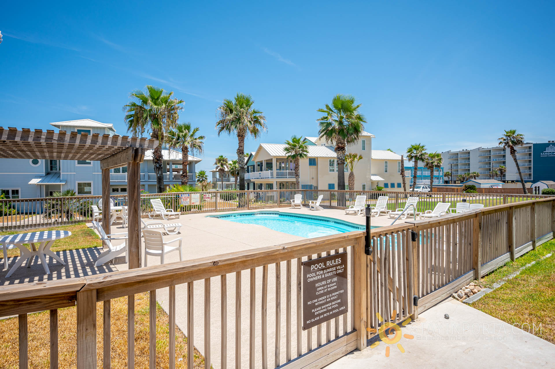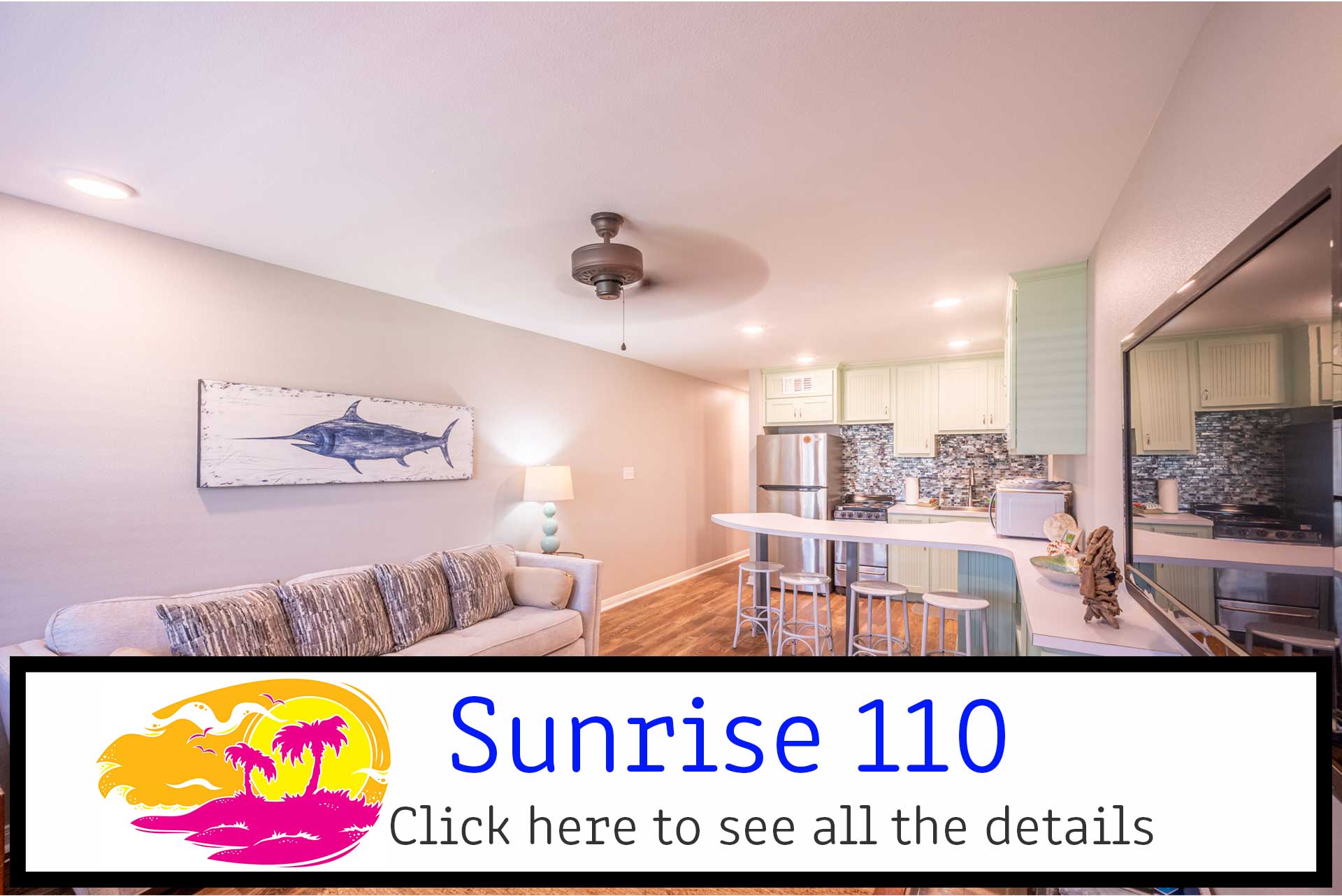 Sunrise Villa #110 is a lovely 1 bedroom 2 bathroom ground floor condo. Sleeps 4, This corner unit has a nice patio which is gated and partially covered overlooking the grassy lawn. There is a Queen bed in the bedroom and sleeper sofa in living room. There is a nice sized pool with shaded areas patio furniture tables and chairs.. The boardwalk to the beach is only about a 5 minute walk away. There is a coin laundry room for your use on property. sorry no pets no smoking. You will have 1 assigned parking space, no boats, no trailers. There is limited amount of unmarked parking spaces for guests or 2nd vehicles/ golf carts. This condo is located in the golf cart approved driving area.